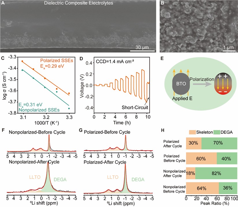 BTO引入后,复合骨架的居里温度降至28°C,室温介电常数高达3700,有利于Li盐解离与Li⁺迁移;极化后,复合电解质的离子电导率由1.9×10⁻⁴提升至2.4×10⁻⁴ S·cm⁻¹,活化能由0.34 eV降至0.29 eV;临界电流密度(CCD)达1.4 mA·cm⁻²,优于未极化样品。