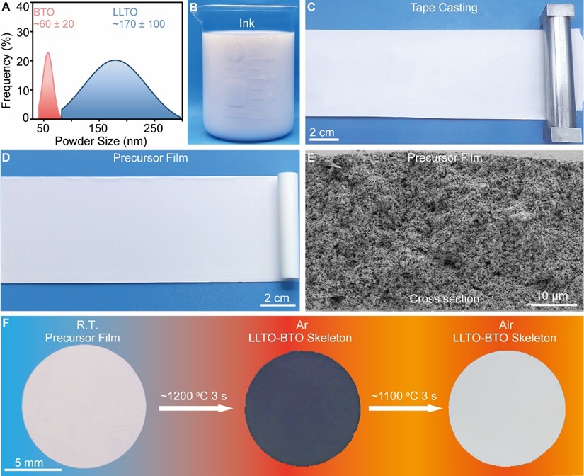 图2、(A)LLTO与BTO粉末粒径分布;(B)刮刀涂布墨水照片;(C)前驱膜照片;(D)干燥后前驱膜可卷曲;(E)前驱膜截面SEM图,厚度约40 μm;(F)烧结前后膜颜色变化。