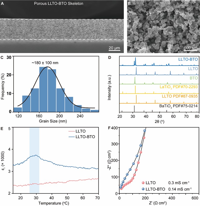 图3、(A)与(B)为LLTO–BTO骨架截面SEM图;(C)晶粒尺寸分布,平均约180 nm;(D)XRD图谱,显示纯立方石榴石结构;(E)介电常数–温度谱图;(F)Nyquist图,比较LLTO与介电复合电解质电导率。
