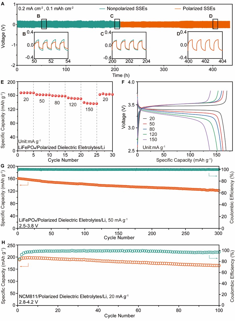 对称电池:极化电解质在0.2 mA·cm⁻²下稳定循环430小时,极化电压显著低于未极化样品;LiFePO₄全电池:极化电解质在50 mA·g⁻¹下循环300圈容量保持率76%,库仑效率>99%;倍率性能优异,1C下容量达137.5 mAh·g⁻¹;NCM811全电池:极化电解质在20 mA·g⁻¹下循环100圈容量保持率87%,库仑效率达98%,展现出良好的高电压稳定性。